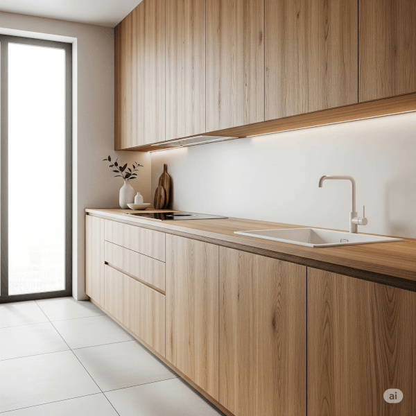 - 📌 מטבח מודרני בעץ אלון – עם אחסון חכם ומשטח עבודה רחב.